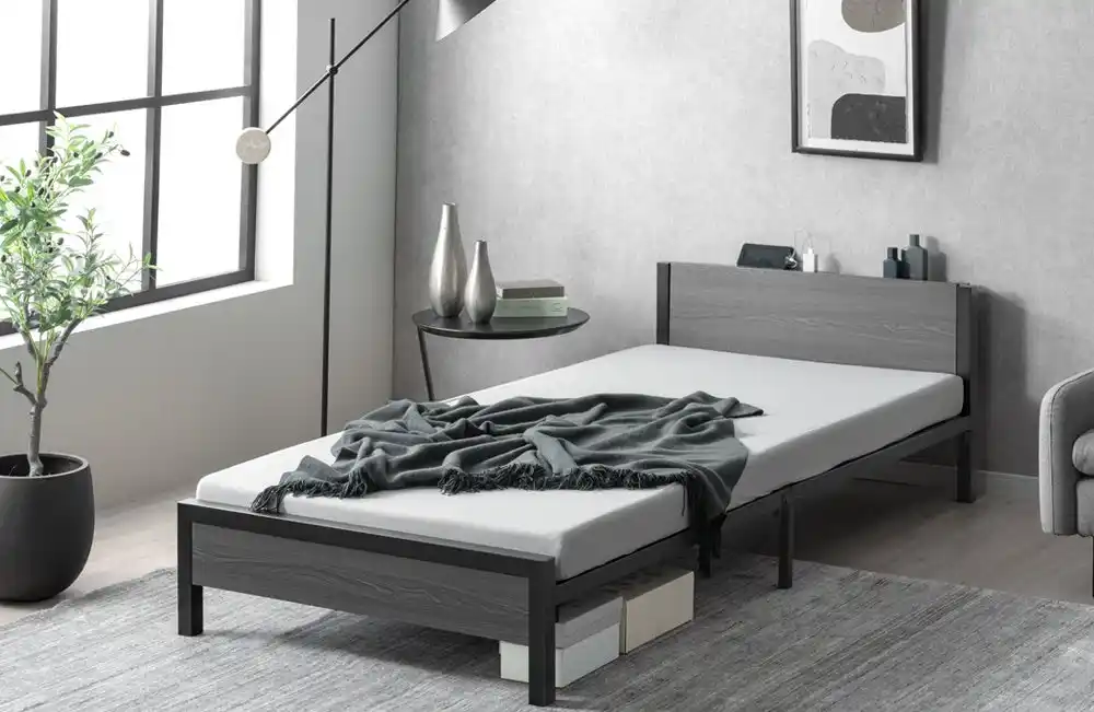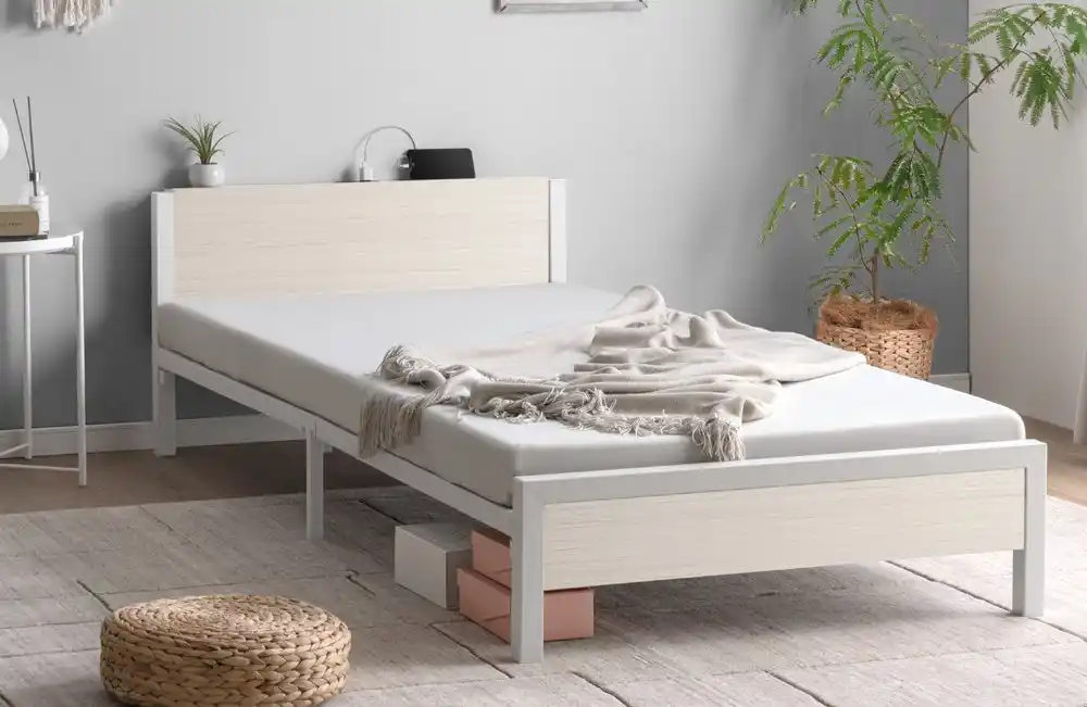 シンプルなデザインながら細部までこだわり、フッドボードはストッパー構造になっているのでマットレスが下にずれることを抑制してくれます。またスチール素材のフレームになっているので床を傷つけにくい、傷防止キャップも取り付けているのでより安心してご使用いただけます。 |