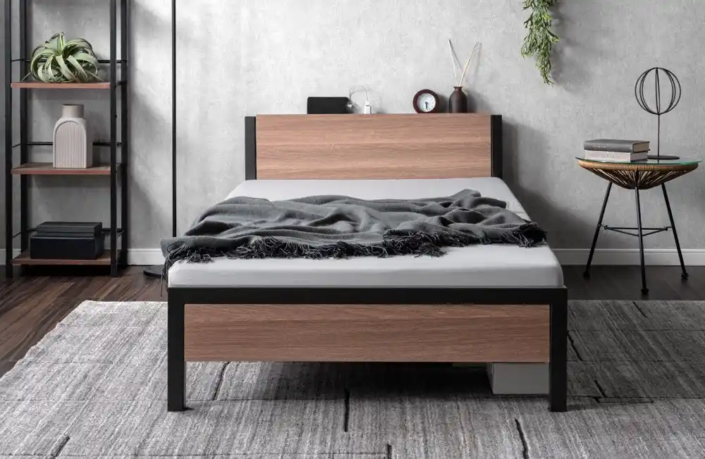 スチールのフレームに木目調のパネルを合わせたベッドです。シンプルなデザインなのでどんなお部屋にもあわせやすいデザインになっています。 |