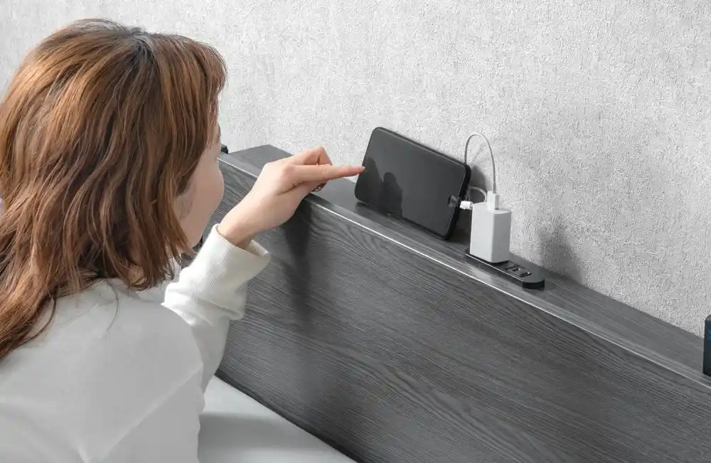 充電しながらスマホを立てかけたり、お気に入りの小物を飾ることができる宮棚が付いています。コンセントは埃の侵入を防ぐスライドカバー付きとなっているので、安心してご使用いただけます。 |