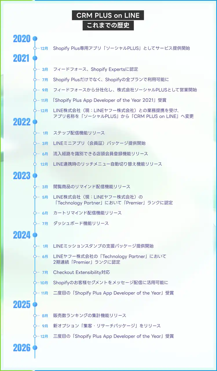 株式会社ソーシャルPLUS(所在地:東京都港区、代表取締役:塚田 耕司)が提供する、LINE連携Shopifyアプリ「CRM PLUS on LINE」は、2025年12月をもってサービスリリースから5周年を迎えました。 |