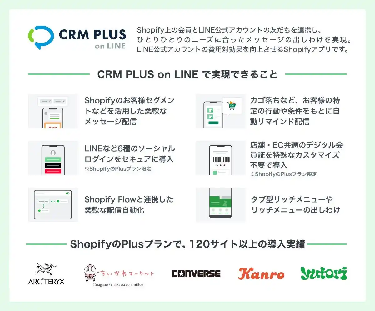 「CRM PLUS on LINE」は、Shopify上の会員IDとLINEのユーザーIDを連携し、一人ひとりの購買履歴や行動データに基づいたメッセージ配信や、LINE公式アカウントを通じたスムーズな購入体験を実現するShopifyのLINE連携アプリです。 |