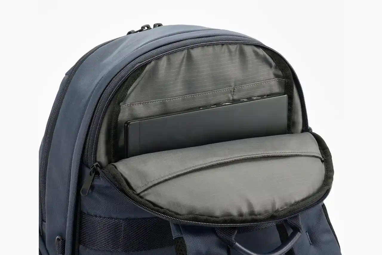 リュック背面に、本体とは別に独立したPC収納部を配置。雨除けフラップ付きで、フラップ内のポケットにUSBメモリやモバイルWi-Fi などを収納可能です。 |