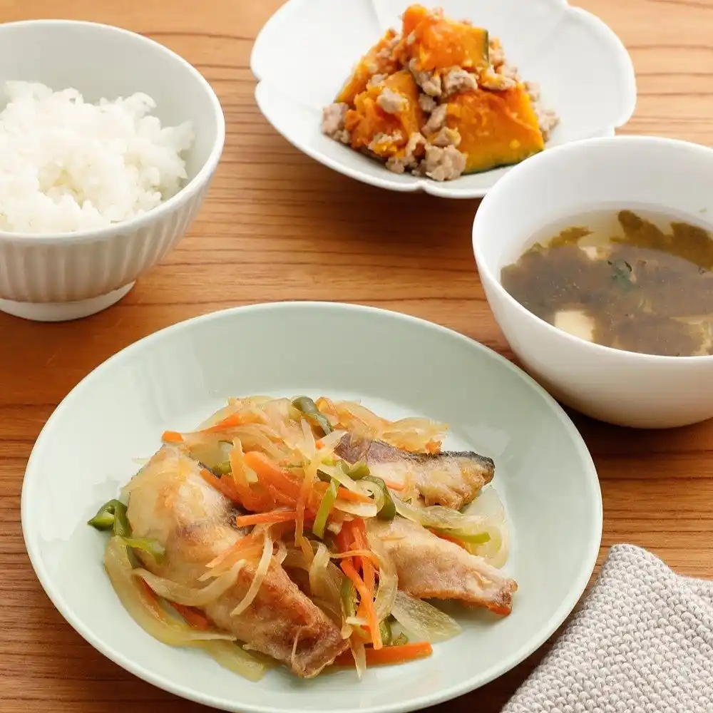 さっぱりとした主菜に甘めのおかずを合わせて 南蛮漬けの献立 |