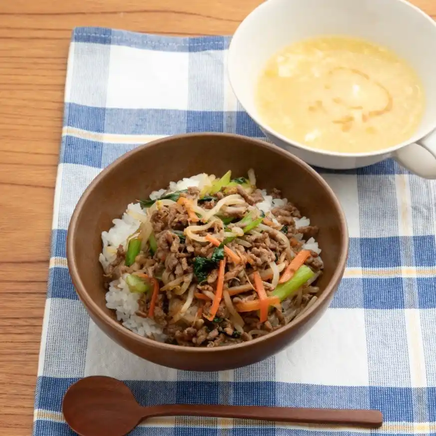 肉と野菜がとれる主役ごはんとやさしい甘さの鶏だしスープ! ビビンバ風ごはんの献立 |
