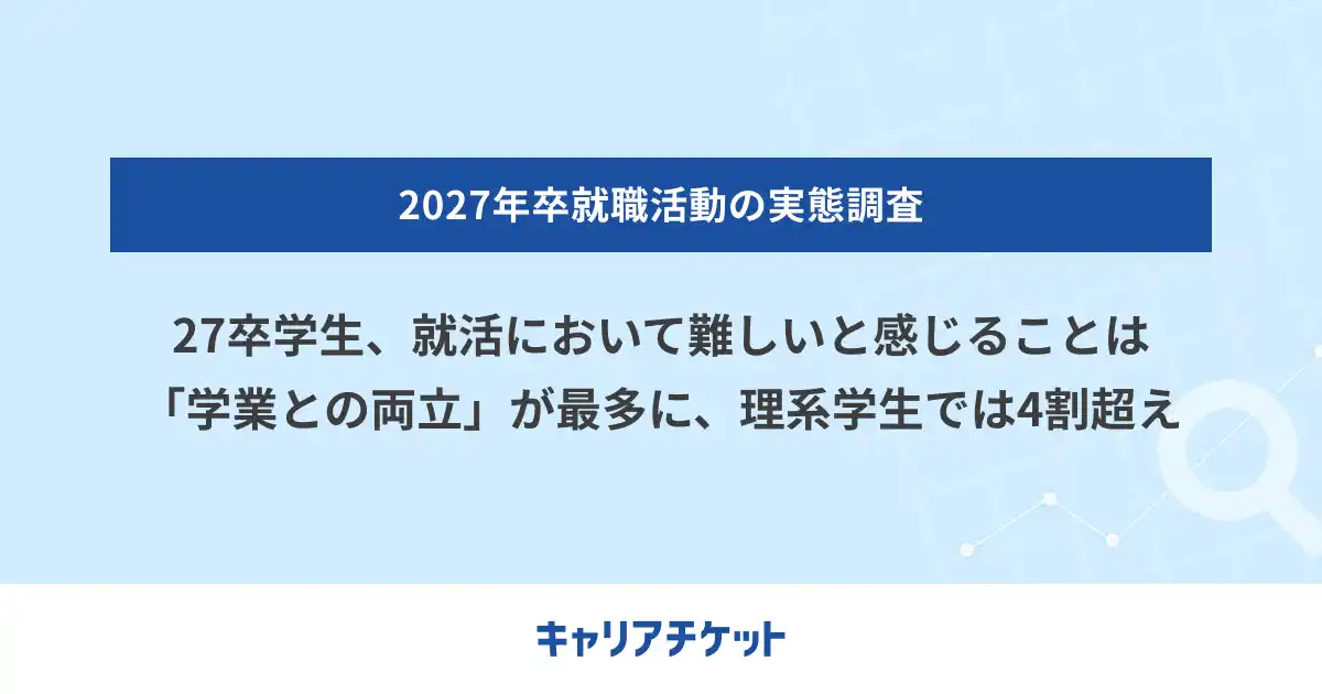 今回の調査では、2025年12月時点で約7割の27卒学生が就職活動を開始しており、中には内定を獲得する学生の存在も明らかになりました。就職活動を早期に始める学生が多い一方で、就職活動において最も難しいと感じることは「学業との両立」であるという結果も得られています。 |