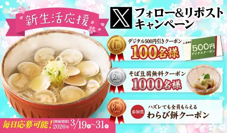 株式会社家族亭(本社:大阪府大阪市、代表取締役執行役員社長:坪山憲司)が運営するそば和食チェーン「家族亭」は、2026年3月19日(木)午後8時~3月31日(火)の期間、家族亭公式Xにて「家族亭デジタル500円引きクーポン」が抽選で100名様に当たる『新生活応援 Xフォロー&リポストキャンペーン』を開催いたします。 |