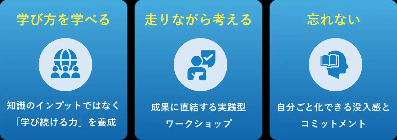 「令和の研修」では、特定の知識を覚えること以上に「その学びをどう使えるのか」を習得することを重視しています。学びの仕組みや意味合いを理解することで、受講者は変化する状況に合わせて自走し、自律的に成長し続けることが可能となります。 |