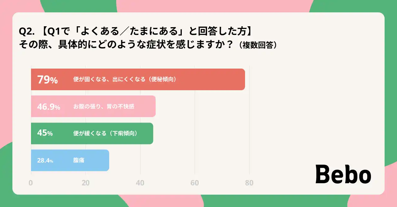 その症状は「便の出にくさ(79%)」 だけでなく、「張り・不快感(46.9%)」 、「便のゆるみ(45%)」や「腹痛(28.4%)」 など身体的な苦痛を伴っています。 |
