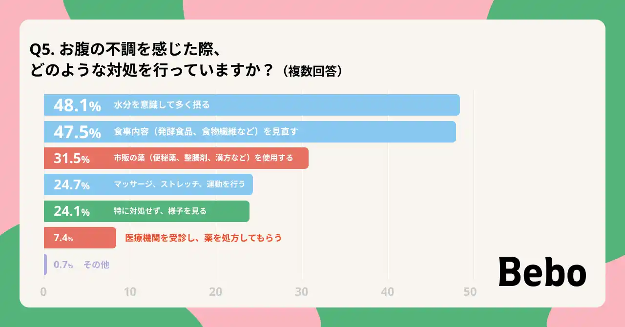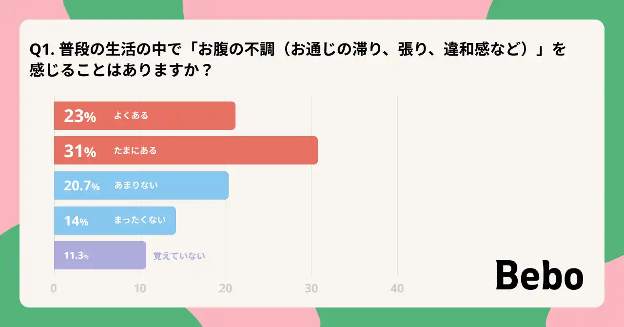 便秘タイプのセルフチェックと適する市販薬の提案・購入を一体化したオンラインサービス『Bebo(ビーボ)』を提供する株式会社エムボックス(本社:東京都中央区、代表取締役CEO:金澤 大介、以下:エムボックス)は、「お腹の不調」に関する調査を実施しました。