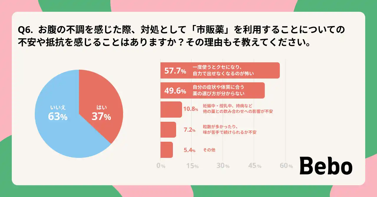 市販薬の利用に不安を感じる理由として、「一度使うとクセになり、自力で出せなくなるのが怖い」という依存への恐怖が約6割(57.7%)に達しており 、次いで「自分の体質に合う選び方がわからない(49.6%)」 という迷いも。「依存への不安」が、適切なセルフケアを躊躇させる大きな要因となっています。 |