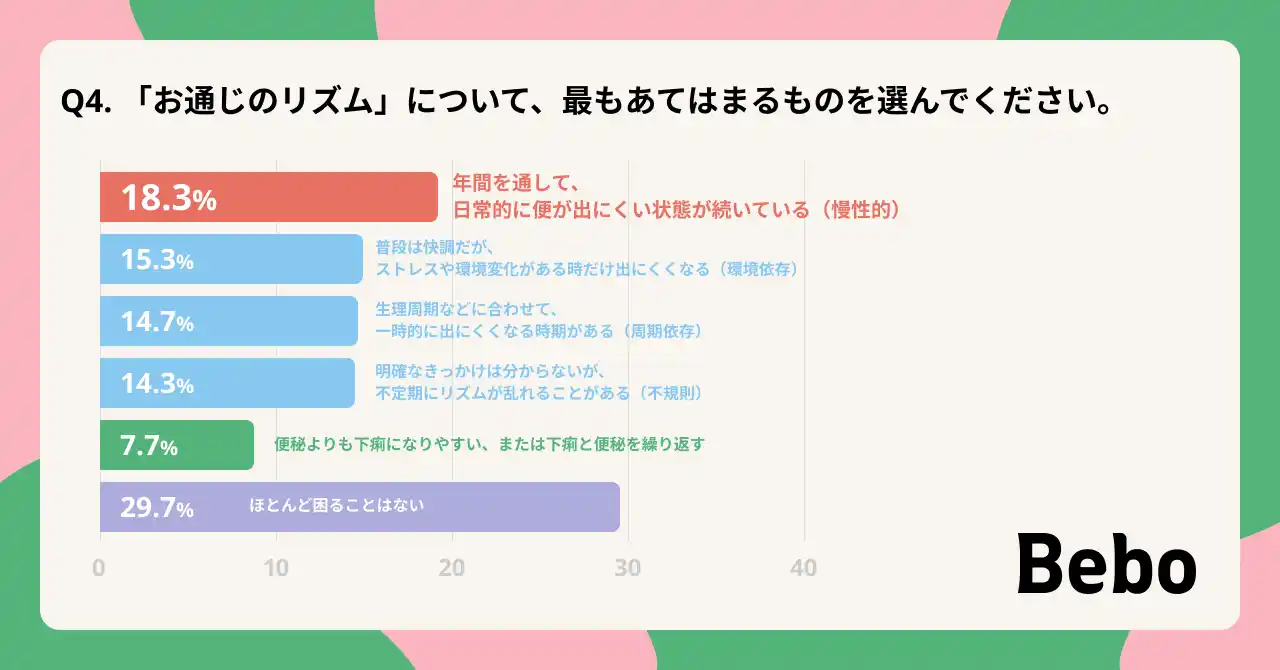 年間通して慢性的にお腹の調子が悪い層(18.3%) よりも、環境変化や女性特有の周期によって一時的にリズムを崩す「ゆらぎ便秘」層(環境・周期・不規則の合計:44.3%)の方が多い実態が判明しました 。 |