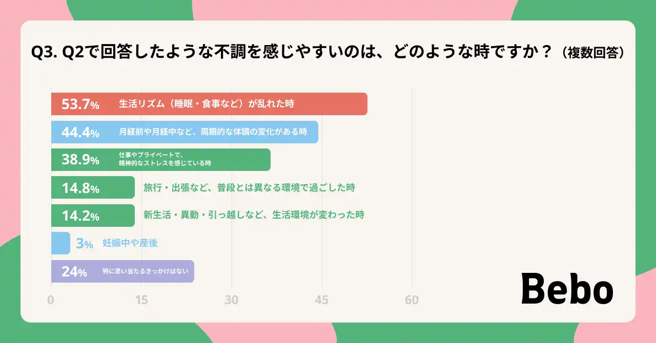 不調を感じるきっかけの第1位は「生活リズムの乱れ(53.7%)」であり 、春の新生活シーズンは特に注意が必要です。 |