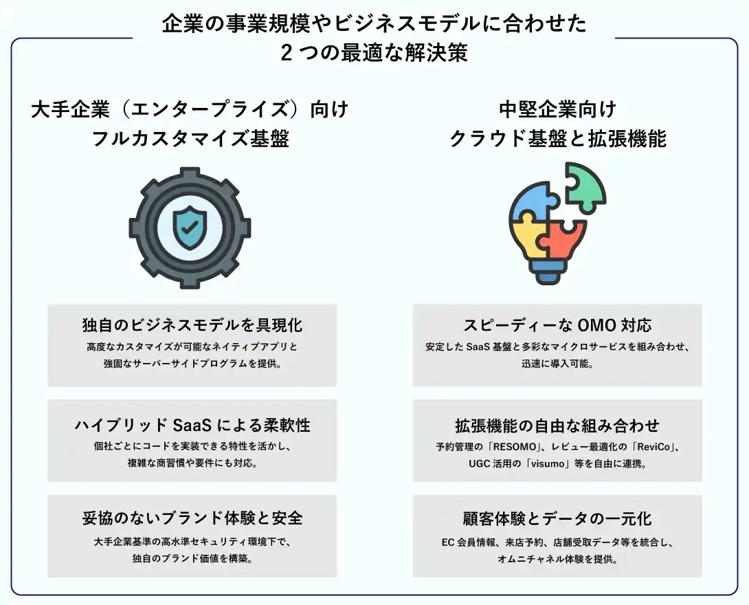 | あらゆる規模の企業が、自社のビジネスモデルに最適な形でリアル(実店舗)とデジタルを融合できるよう、以下の2つの解決策を提供します。 | ||||||||||