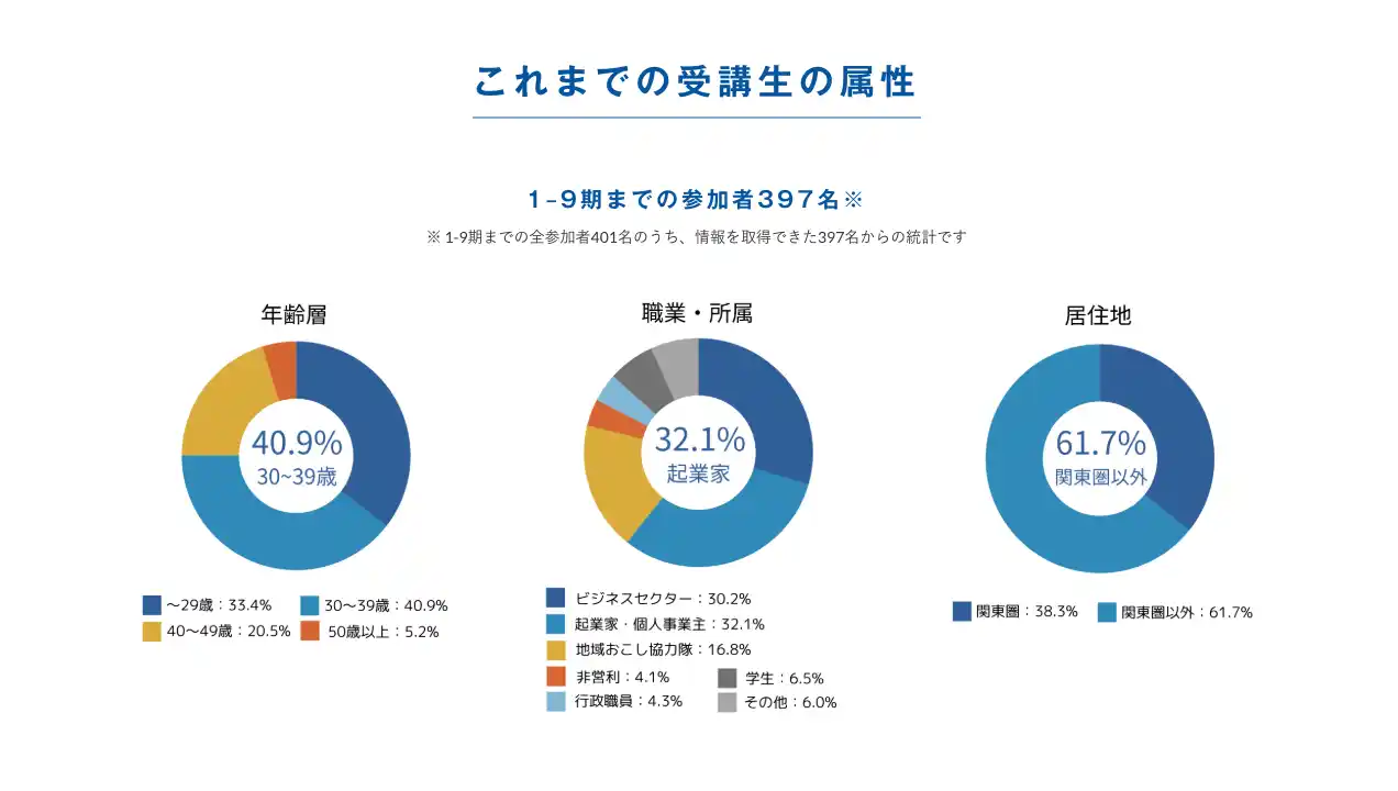 参加者の属性は、起業家、個人事業主、地域おこし協力隊、家業後継者、団体職員、都市部大企業・ベンチャー企業・地方の中小企業の会社員、自治体職員、研究者など多様。20-40代が70%以上。これまでに全国160市町村以上、そのうち61.7%が関東圏以外から参加しています。 |