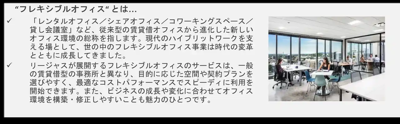 | こうした多様な利用者ニーズに対し、リージャスが持つ柔軟な契約体系、多彩な個室タイプ、全国・世界のネットワークを活用できる点は大きな価値を提供します。本拠点の開設により、地域企業の成長支援や新たな交流・協業の創出を後押しするとともに、横浜都心・臨海部におけるビジネス活性化に寄与してまいります。 | ||||||||||||||||||