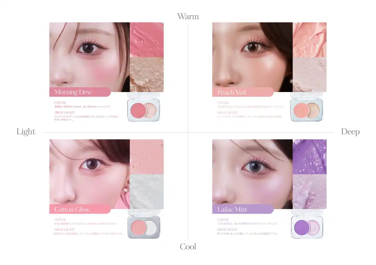 イエベ/ブルベ × フレッシュ 透け感コーラルピンクチークとピンクラメハイライトで どんなシーンでも使いやすく透明感のある軽やかな仕上がり。 |