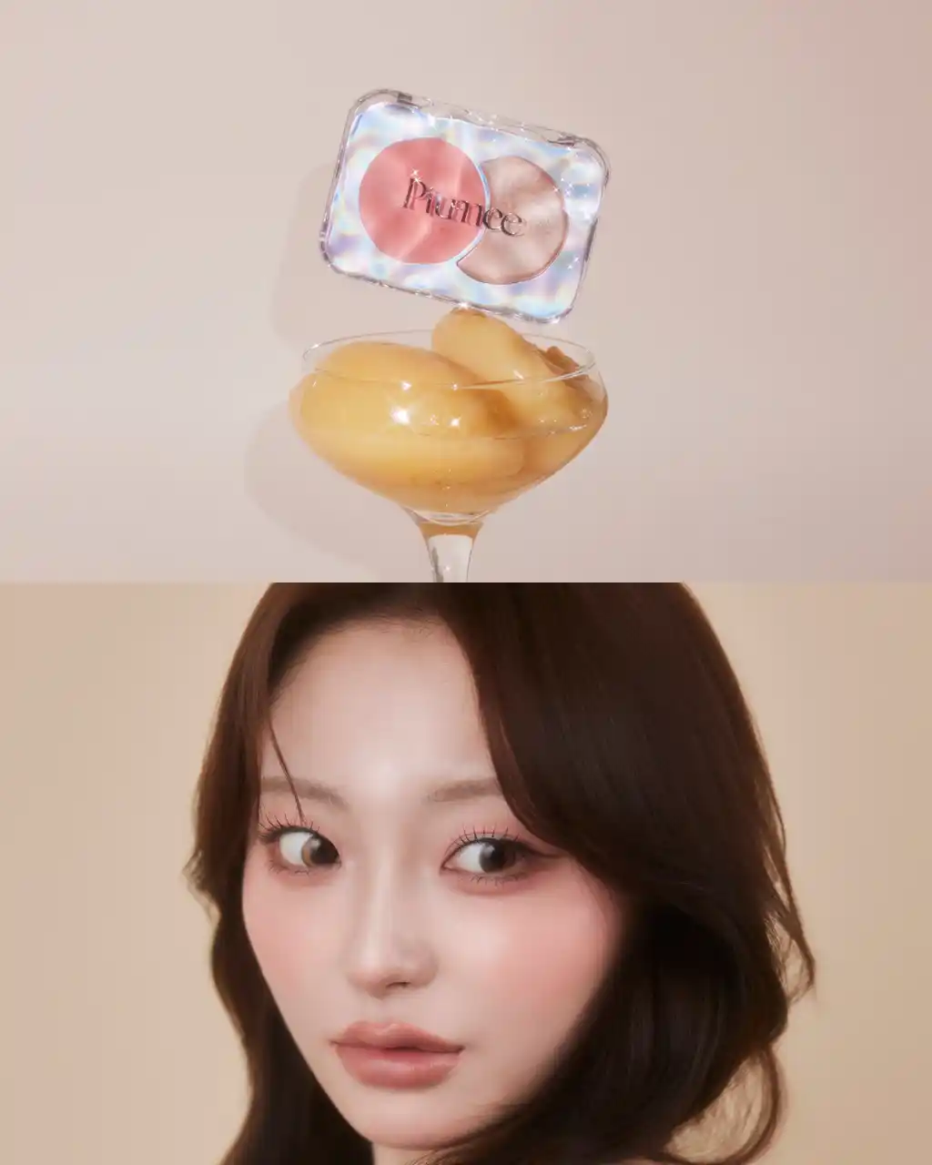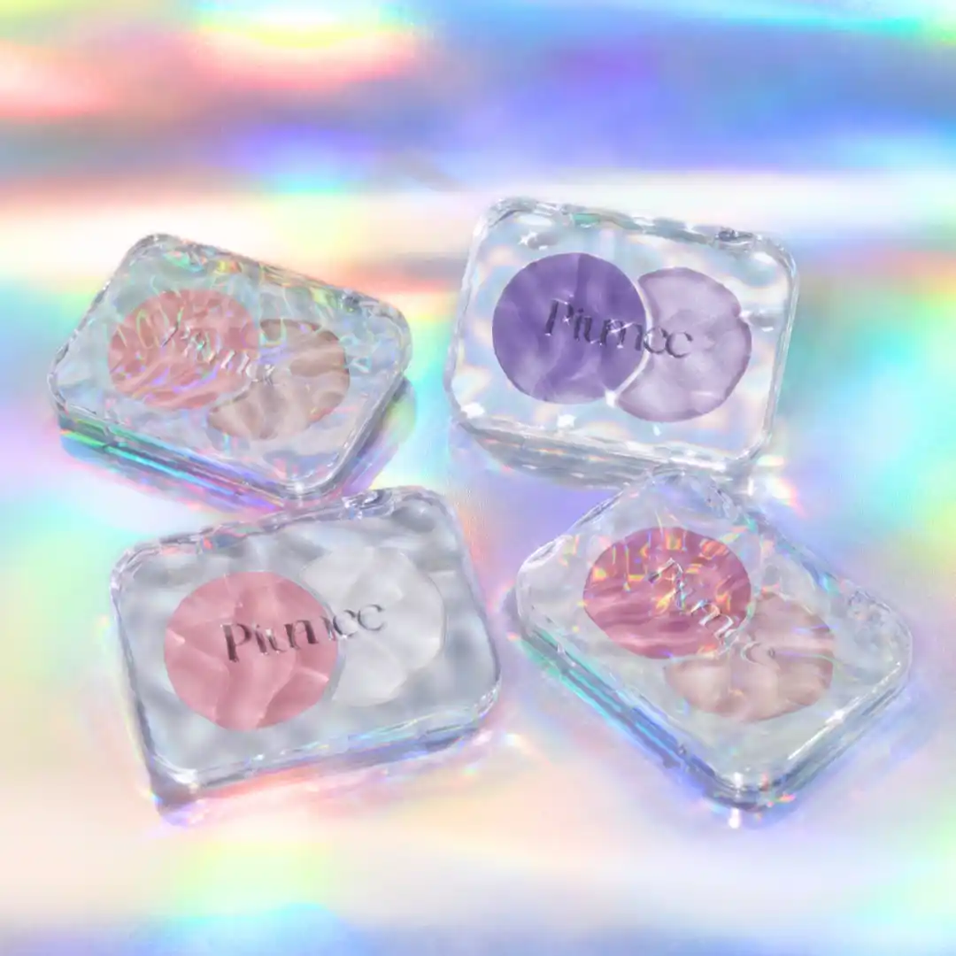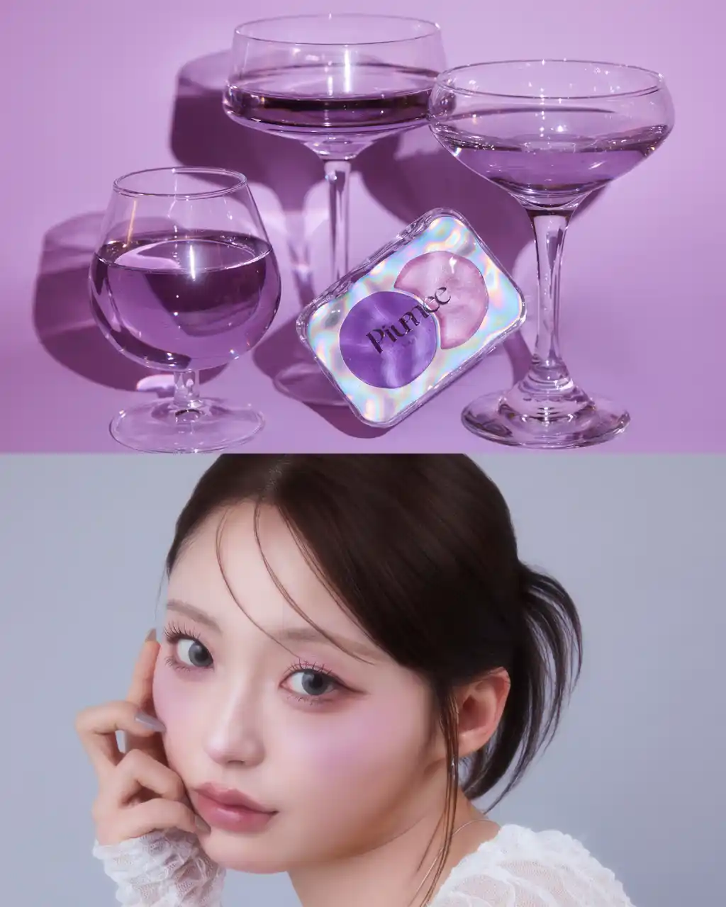 ライラックピンクチークと青ラメで透けるようなツヤ感ハイライトで透明感と上品さを演出。 |