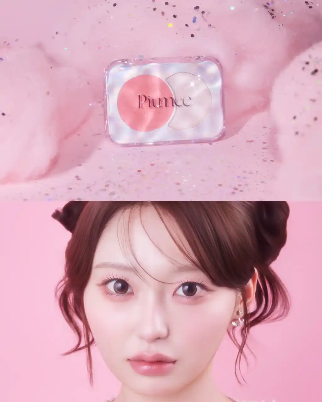 白みピンクチークとピンクラメで偏光ピンクのようなキラメキ ハイライトで簡単にふんわり甘いアイドル顔に。 |