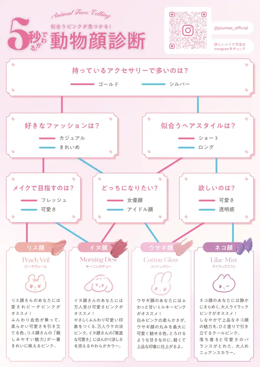 Piumeeでは、簡単な質問に答えるだけで 自分に似合うチークカラーがわかる「動物顔診断」を用意しています。 |