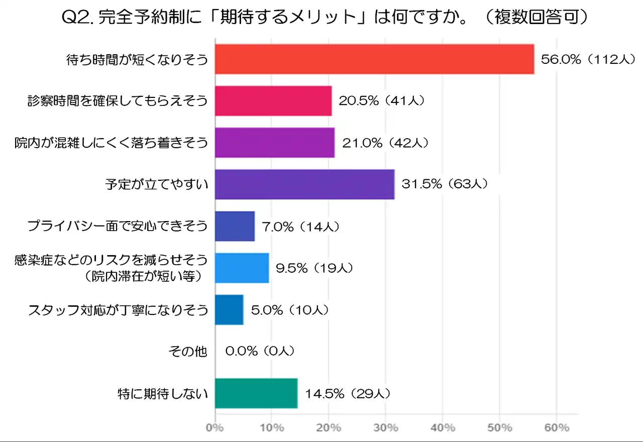 次いで多かったのは「予定が立てやすい」31.5%(63人)でした。受診時間の目安が事前に分かることで、仕事や家事、外出の予定と調整しやすくなる点をメリットとして捉える人も少なくないようです。忙しい日常の中で時間を有効に使いたいというニーズが背景にあるといえるでしょう。 |