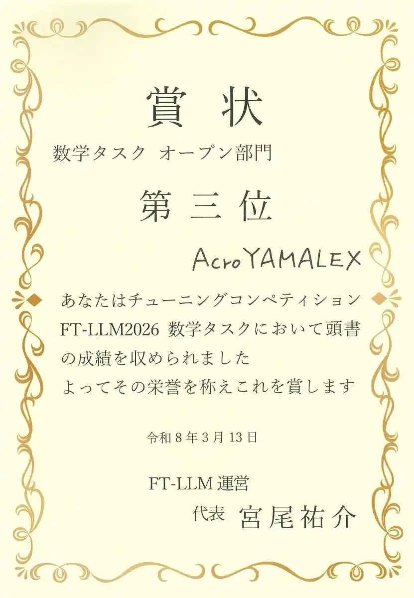 アクロクエストテクノロジー株式会社(本社:神奈川県横浜市・代表取締役:新免流、以下、アクロクエスト)のデータサイエンスチームであるAcroYAMALEX(以下、YAMALEX)は、言語処理学会第32回年次大会(NLP2026)で開催された第2回「大規模言語モデルのファインチューニング技術と評価」ワークショップのチューニングコンペティションにおいて、数学タスク部門 第3位を受賞しました。 |