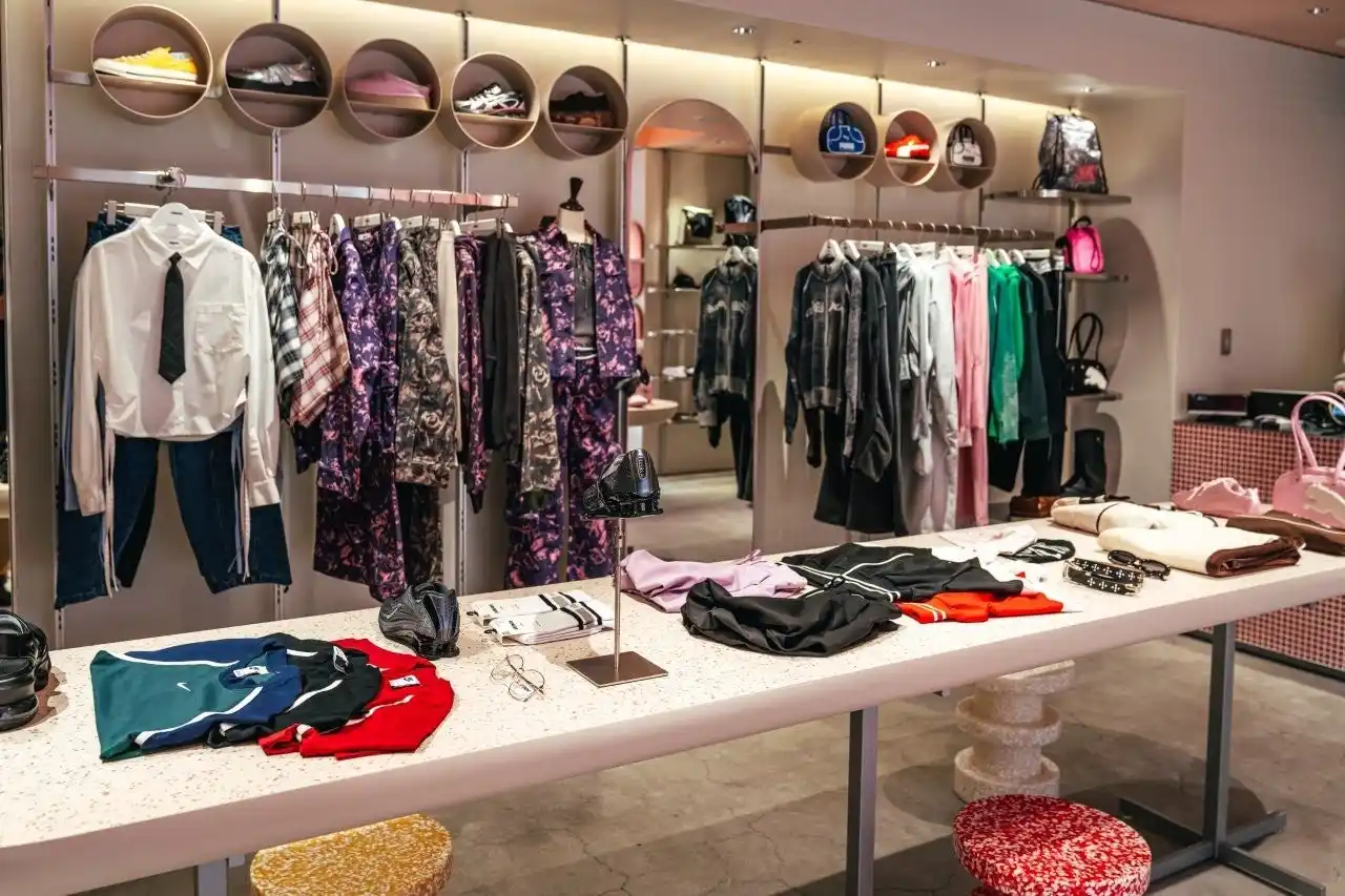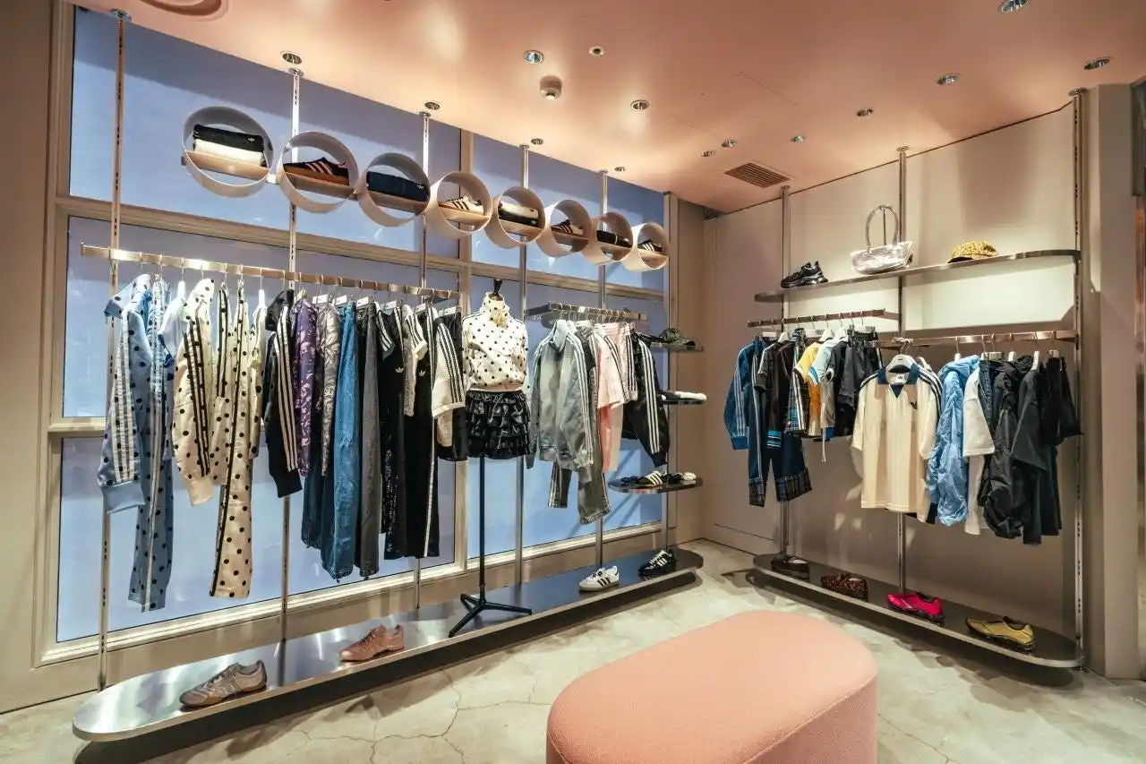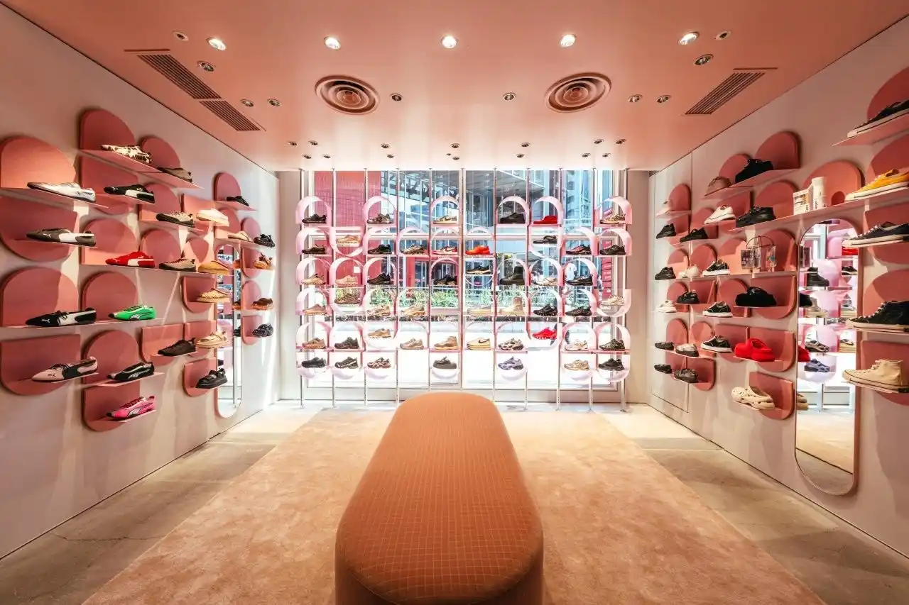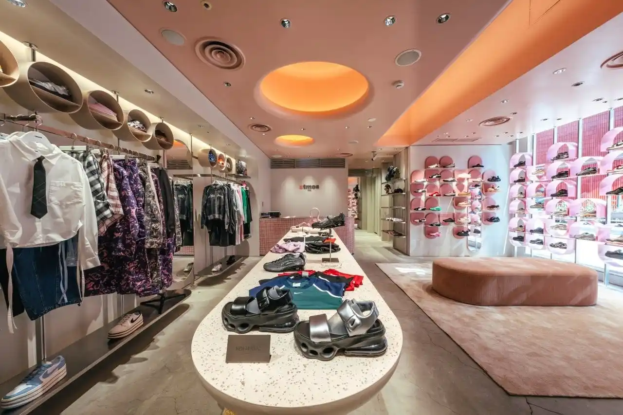 店内は落ち着いたピンクを基調とし、唯一無二の円形デザインが特徴のスニーカーウォールや、Head to toe でスタイリングをイメージできるアパレルウォールを設置。ゆっくりとお買い物が楽しんでいただけるよう大きなソファも用意され、ブティックのような空間となっています。 |