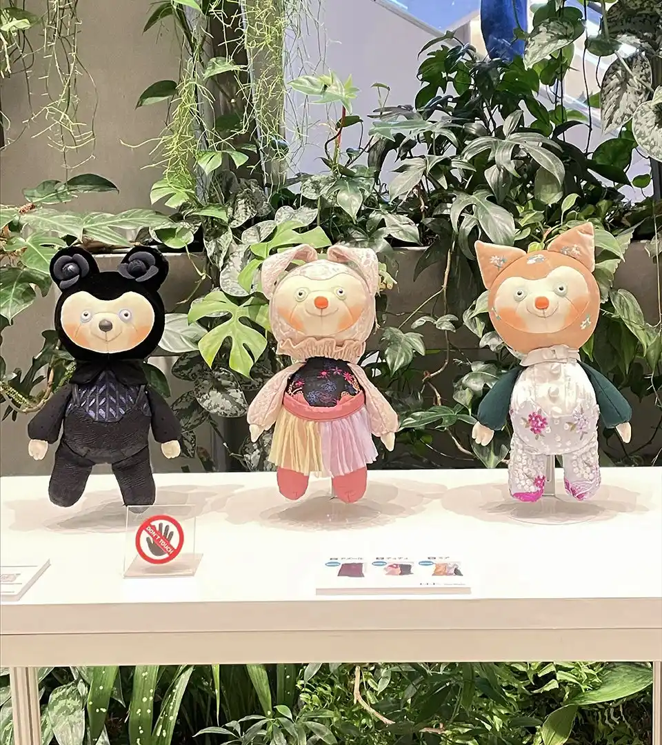 アップサイクルぬいぐるみブランド『Kireppa(キレッパ)』を展開する作者が、アパレルメーカーの服を再生し生まれ変わらせたぬいぐるみ達。袖の装飾をそのままぬいぐるみの首元に使うなど流用しながら、上質な布だからこそ実現する曲線的フォルムを生かしたデザインに仕上げています。 |