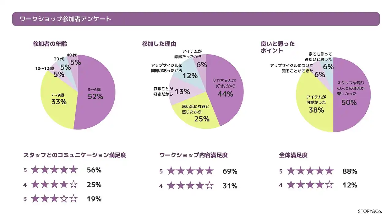 また参加者アンケートでは、全体満足度平均98%と非常に高い評価を得ました。参加理由として最も多かったのは「リカちゃんが好きだから」(44%)で、親しみのあるキャラクターを入口に体験へ導く設計が参加の動機につながっていることがうかがえます。 |