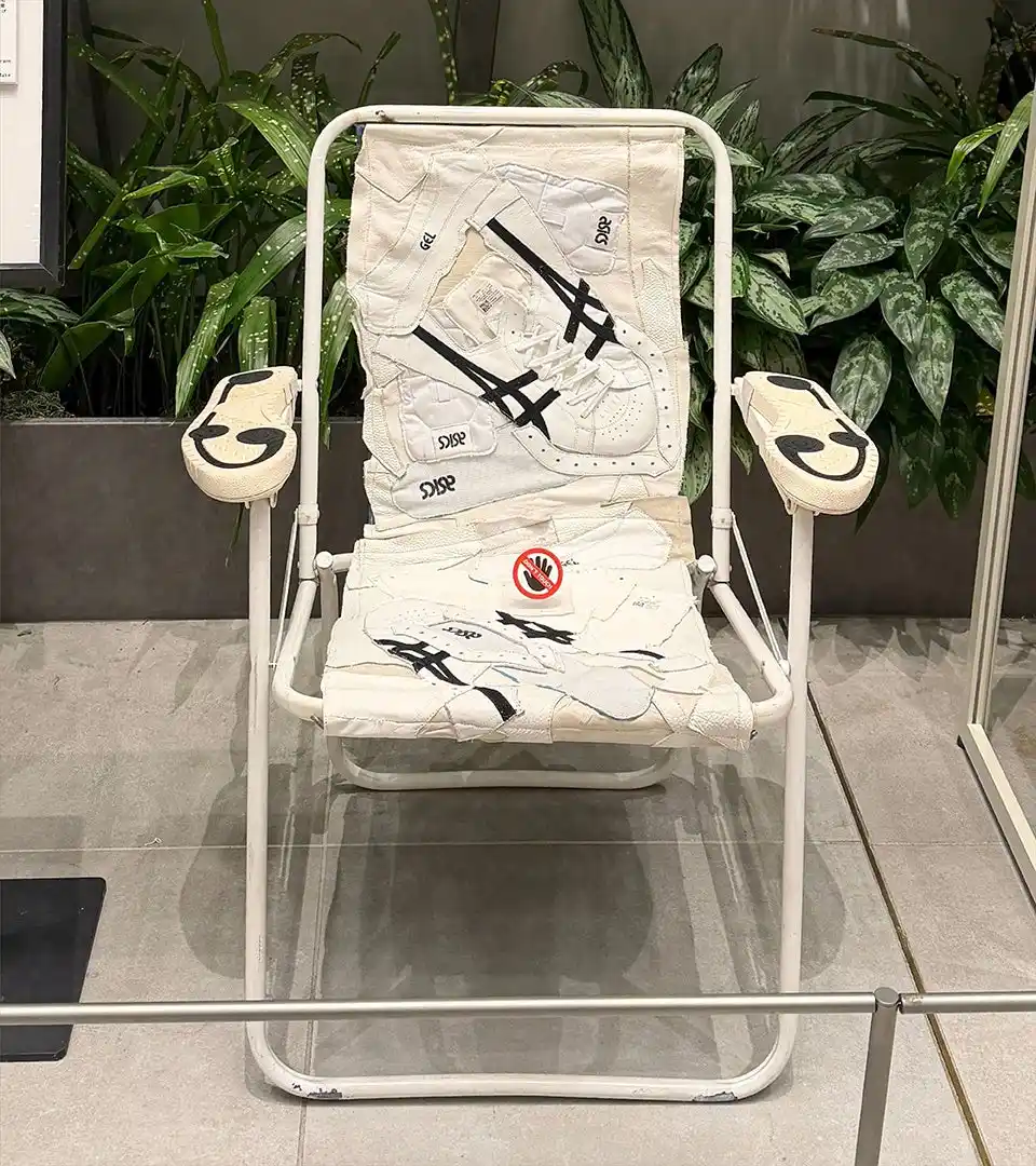 廃棄スニーカーと廃棄イスとの組み合わせで新たな生をいれた作品に仕上げました。 |