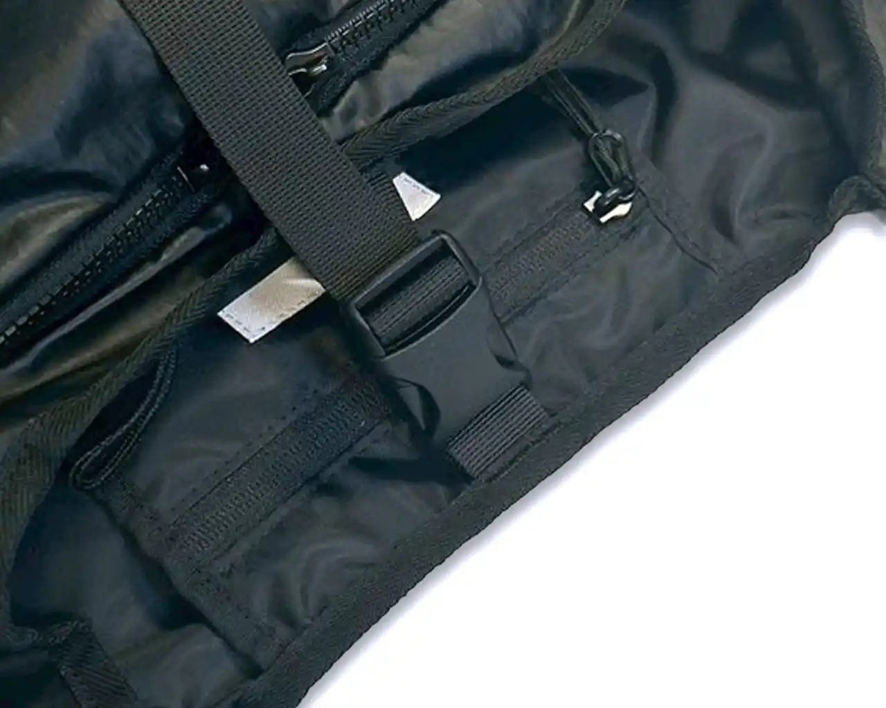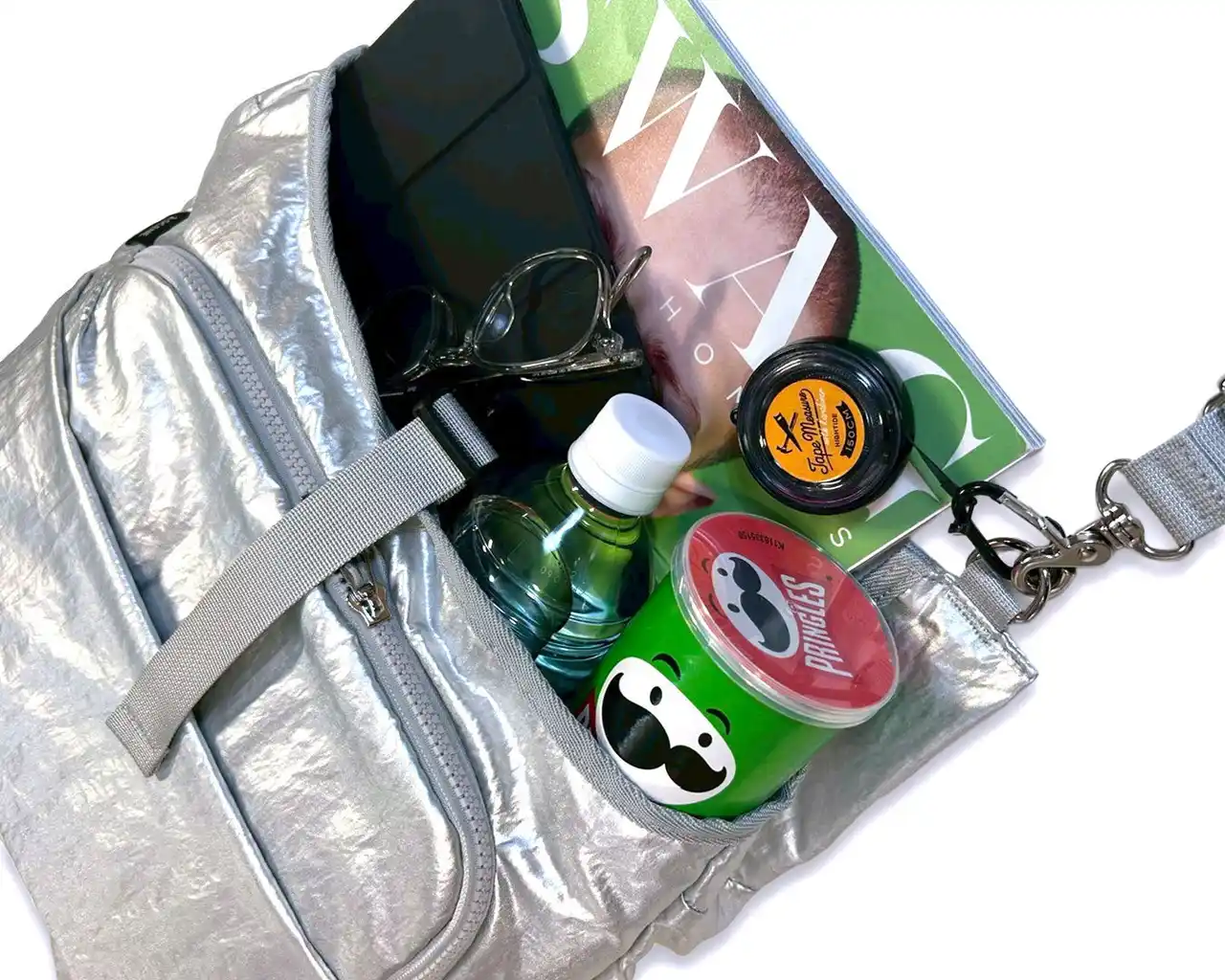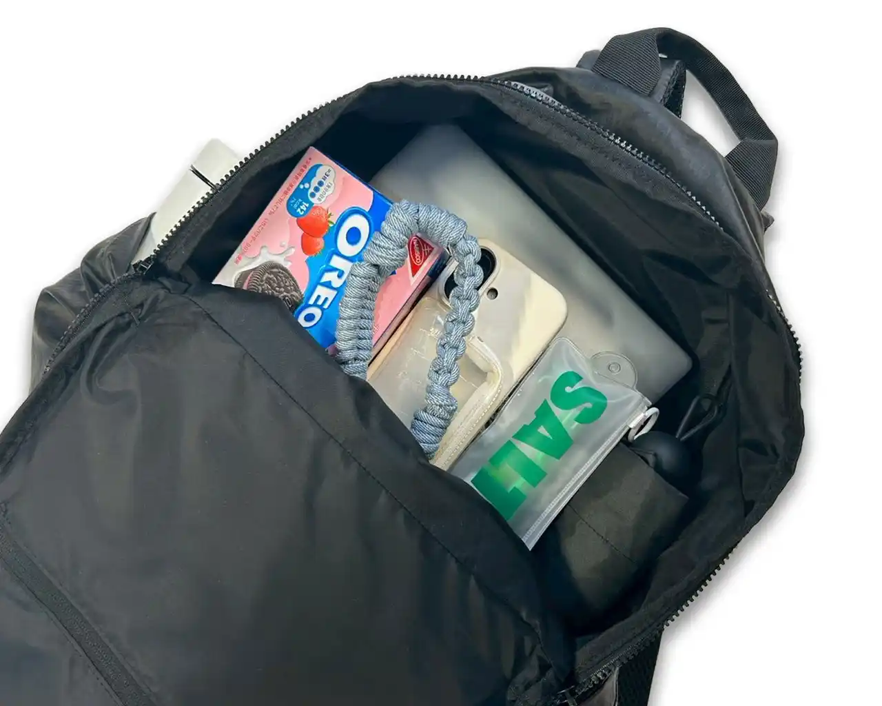 拡張式のメイン収納には500mlのペットボトルがすっきり収まるサイズ感。さらに、フロントには小物整理に便利なジッパーポケットを配置しました。加えて背面にもポケットを備え、 見た目以上の収納力を実現。 |