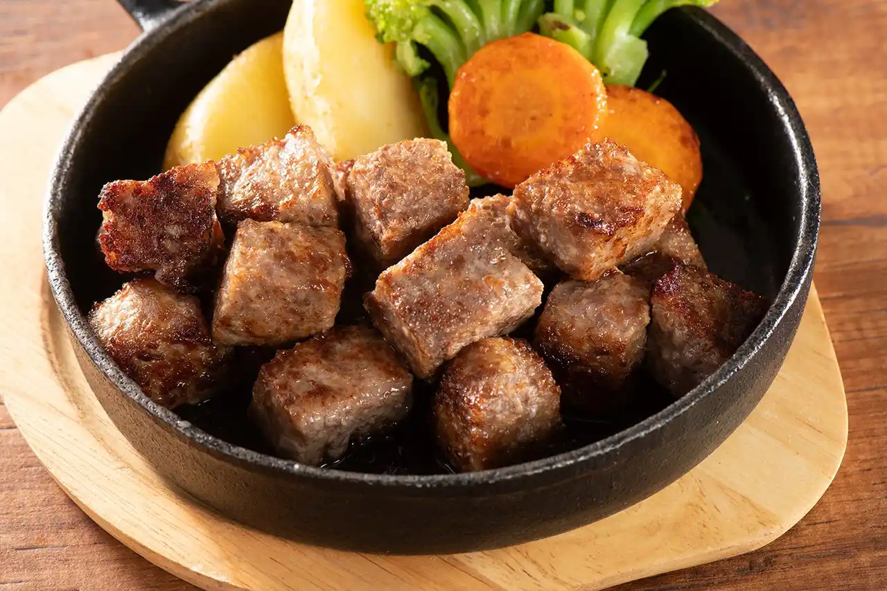 | ■ポイント1:3種類の「サイコロステーキ(成型肉)」をラインアップ | ||||||||||||||