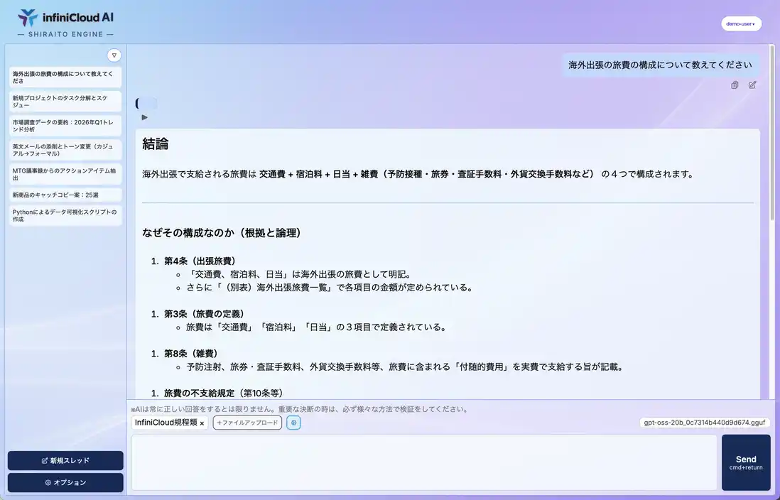 「InfiniCloud(R) AI パッケージ」は、企業が直面する「情報漏洩」「誤答リスク」「コスト不透明性」といった課題を解消するため、自社データを専有のAIに安全に学習させる環境を実現するものです。 さくらインターネットが提供する専有GPU環境を、国内完結かつ高セキュリティなリソース基盤と、「InfiniCloud(R) AI」のファインチューニングやナレッジ再構築機能を組み合わせることで、現場で定着しやすい国産AI基盤を実現します。 また、AutoDGIS※の導入により、ドキュメントに基づく学習データをAIが自動生成できるようになりました。その結果、ハルシネーションの低減や回答の一貫性向上を実現するとともに、ファインチューニング時の学習プロセスの安定性も向上しています。 さらに、フロントエンドUIの統一化とシステム情報表示の刷新により、操作性の改善を行いました。 |