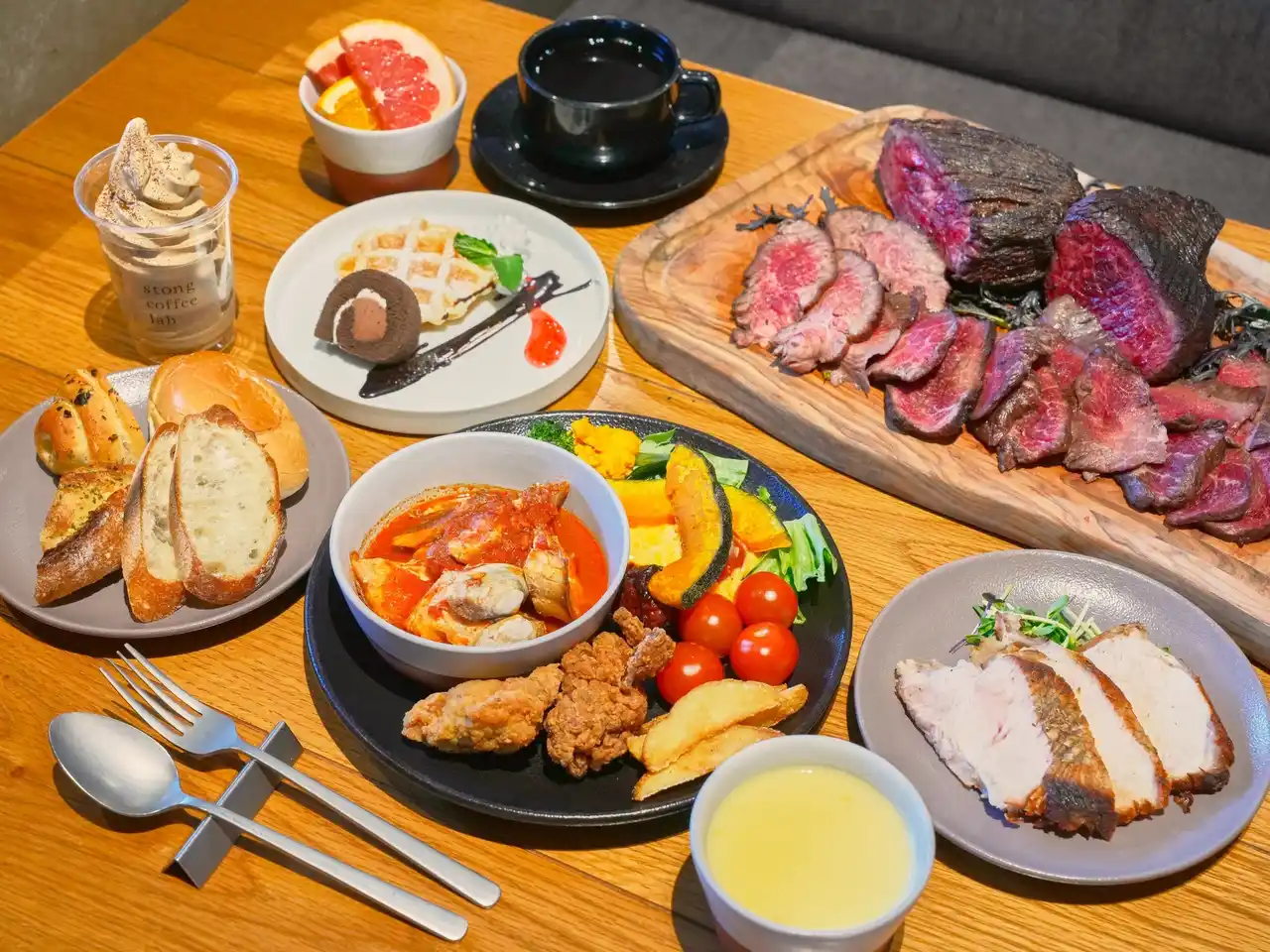 ローストビーフ、トマホーク、肉料理、魚料理、から揚げ、クベルト特製カレー、ペンネグラタン、 パスタ、サラダ各種、ピザ、フライドポテト、焼き野菜、デリ、スープ、パン、特製ワッフル、 |