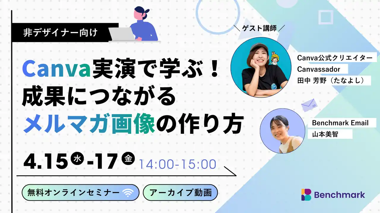 株式会社ベンチマークジャパンは、「Canva実演で学ぶ!成果につながるメルマガ画像の作り方」セミナーを開催します。 |