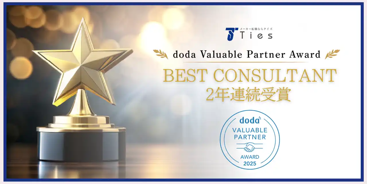 メーカー専門の転職エージェントである株式会社タイズ(本社:大阪府大阪市、代表取締役:今井 良祐、以下タイズ)はこの度、パーソルキャリア株式会社(所在地:東京都港区麻布台、代表取締役社長:瀬野尾 裕)が主催する「doda Valuable Partner Award 2025」に2年連続選出されたことをお知らせいたします。 |