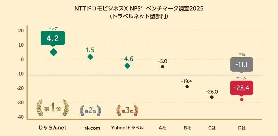 NTTドコモビジネスX株式会社(旧:NTTコムオンライン、本社:東京都品川区、代表取締役社長:稲葉 秀司、以下NTTドコモビジネスX)は、ネット専業型旅行会社を対象にNPSベンチマーク調査2025を実施しました。この結果、最もNPSが高いのはじゃらんnetとなりました。 |