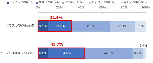トラブルの経験別に旅行時の安心感についても分析したところ、「とてもそう感じる」または「ややそう感じる」と回答した割合はトラブルの経験がある人においては31.6%とトラブルの経験がない人に比べて割合が少なくなり、旅行時に安心感を感じていない傾向がみられました。 |