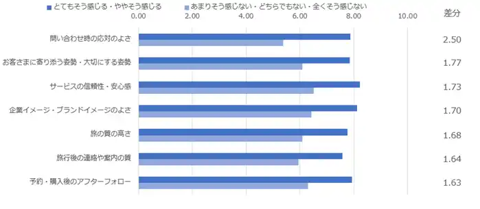 また、旅行時の安心感別に満足度も比較したところ、いずれの項目も「とてもそう感じる」または「ややそう感じる」と回答した人の評価がそれ以外の回答者と比較して高くなりました。最も満足度の差分が大きくなったのは「問い合わせ時の応対のよさ」となり、次いで「お客さまに寄り添う姿勢・大切にする姿勢」、「サービスの信頼性・安心感」、「企業イメージ・ブランドイメージのよさ」、「旅の質の高さ」といった項目で差が大きくなりました。旅行時の安心感を醸成していくことで企業イメージやサービスの信頼感の向上などにつなげられることがうかがえる結果となりました。 |
