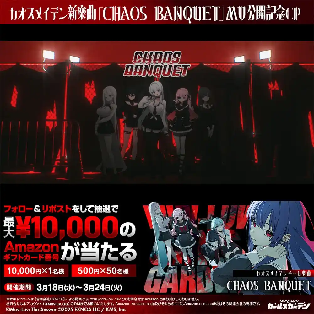 | マブガル公式X(@Muvluv_GG)では、チーム「カオスメイデン」新楽曲「CHAOS BANQUET」のMVを記念して、最大10,000円分のAmazonギフトカード番号が抽選で当たるキャンペーンを開催中です。是非公式Xをフォローしてキャンペーンにご参加ください! | |||