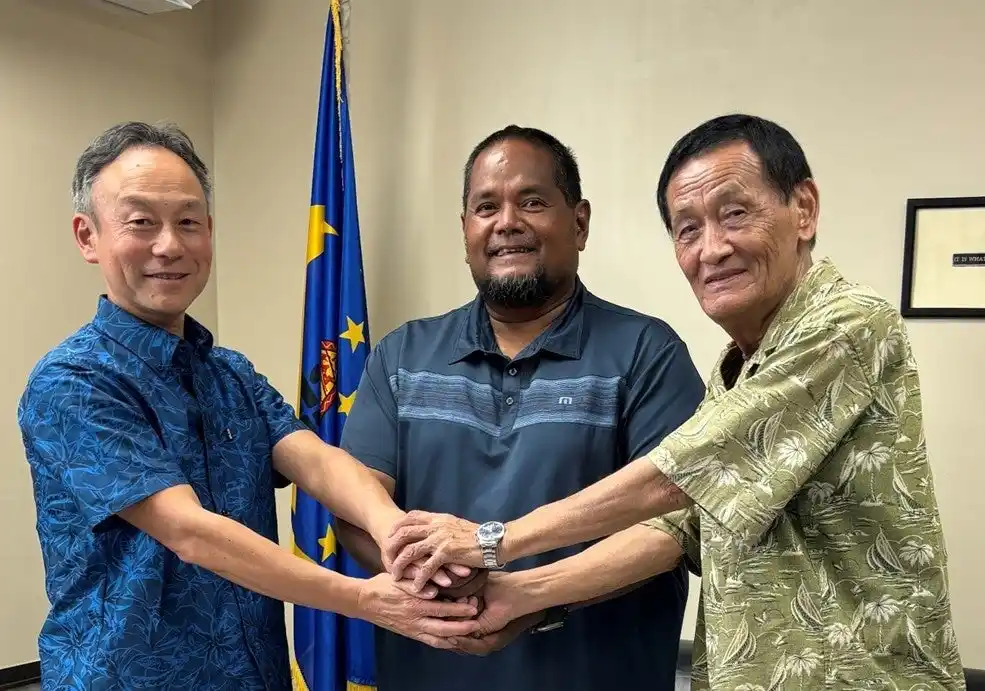 左から、Pacific Islands Development Corporation President 丹下慎也、Eyos Rudimchコロール州知事、パラオ共和国コロール州政府廃棄物コンサルタント 藤勝雄氏 |