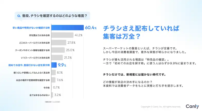 Google ビジネスプロフィール(TM)︎・HP・各SNSの一括管理サービス「カンリー店舗集客」の開発・提供を行う株式会社カンリー(所在地:東京都品川区、代表取締役:辰巳 衛,秋山 祐太朗)は、スーパー業界向けに【「そのチラシ、新規客には届いていますか?」食品スーパーがGoogle マップを整備すべき理由】を無料公開しましたので、ご案内いたします。