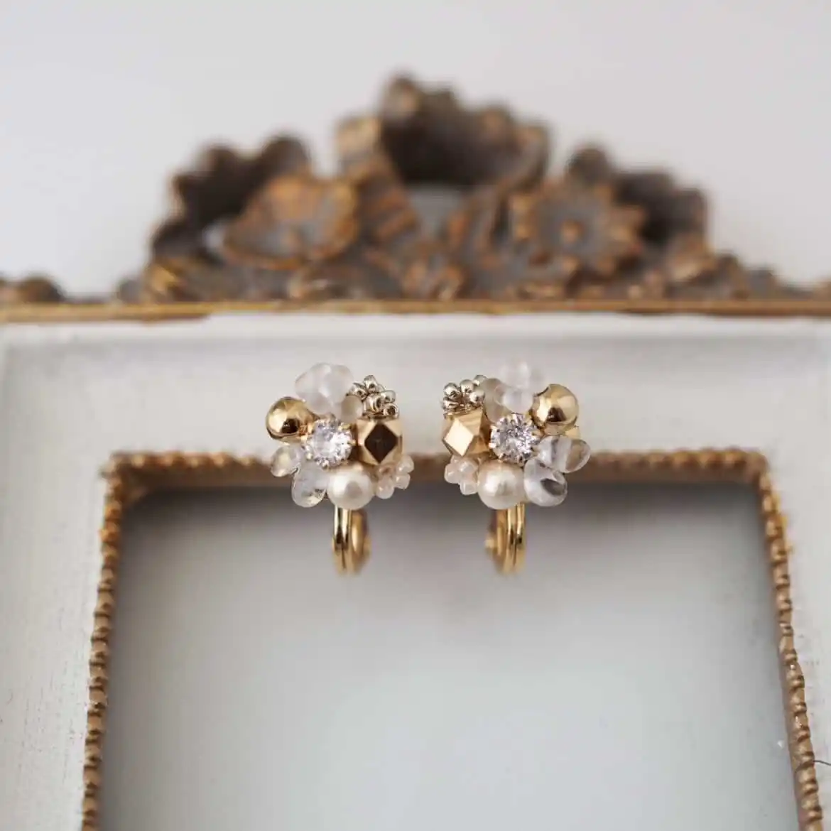 使用しているのはコットンパール。なんと樹脂パールの1/3の軽さなんですって。 1mmほどのビーズが編み合わさり、間に入るゴールドの差し色でなんだかビンテージライクな雰囲気が漂います。 |