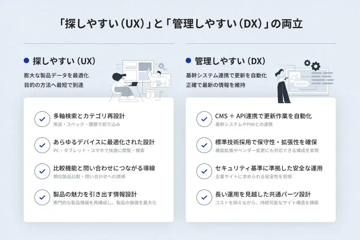 探しやすい(UX):膨大な製品データを最適化し、目的の情報へ最短で到達 |