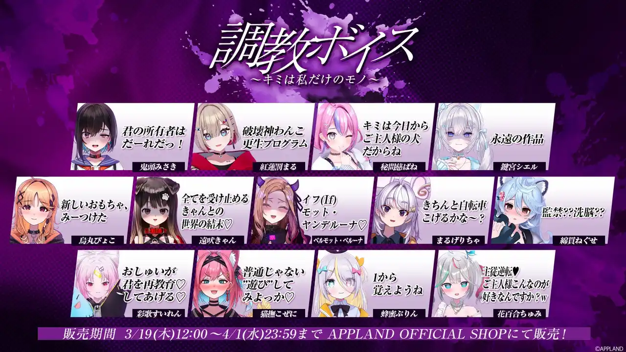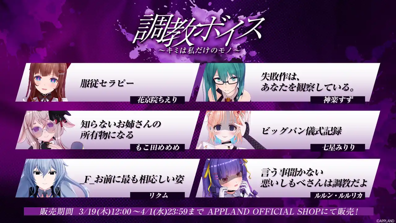 .LIVEとぶいぱいメンバーそれぞれが考案した、"調教"に関するシチュエーションが楽しめるボイスコンテンツをAPPLAND OFFICIAL SHOP(https://4693.live/)にて2026年3月19日(木)12時から販売いたします。 |