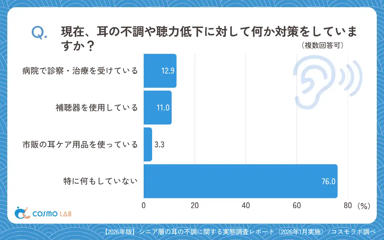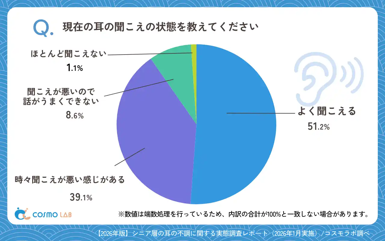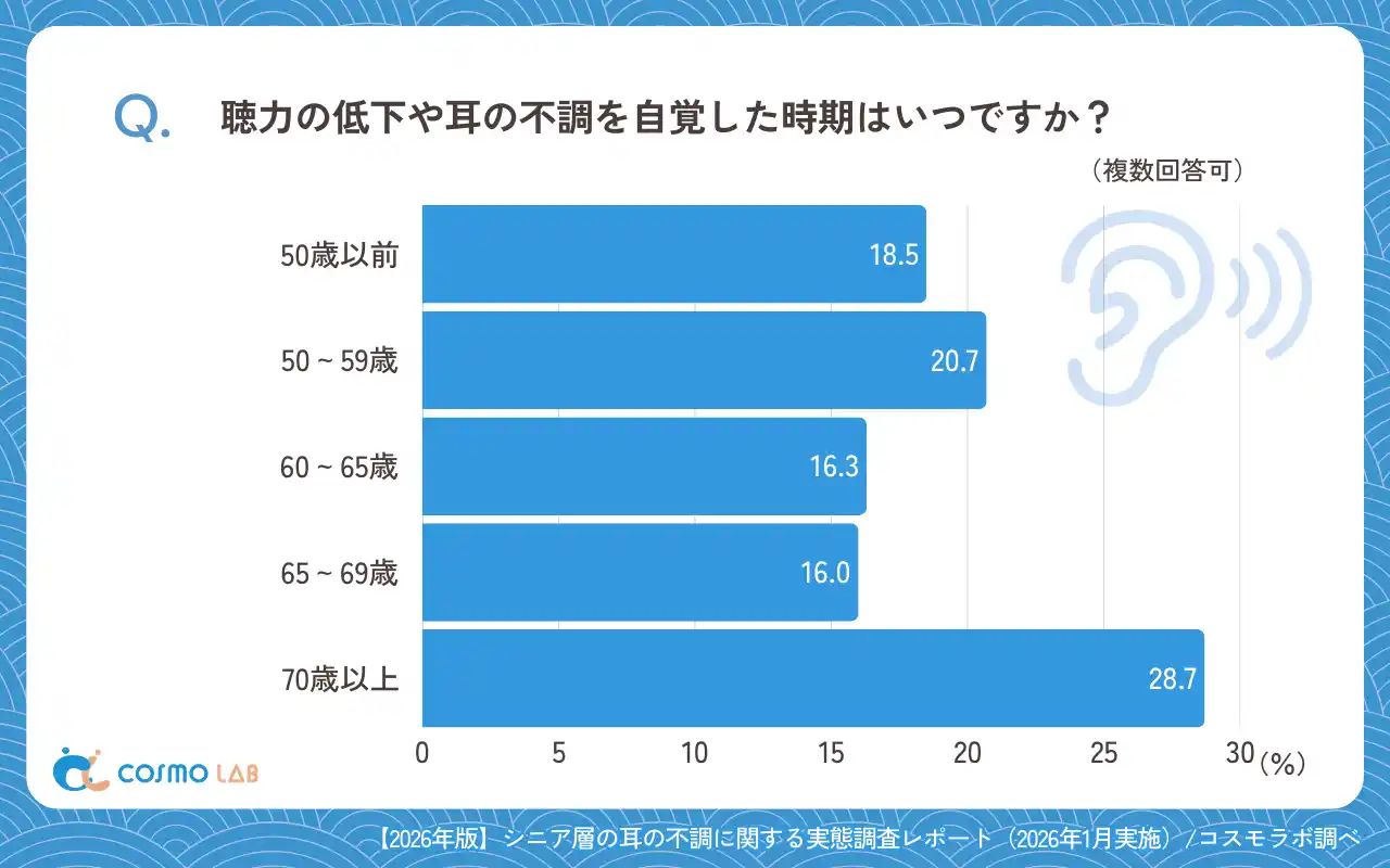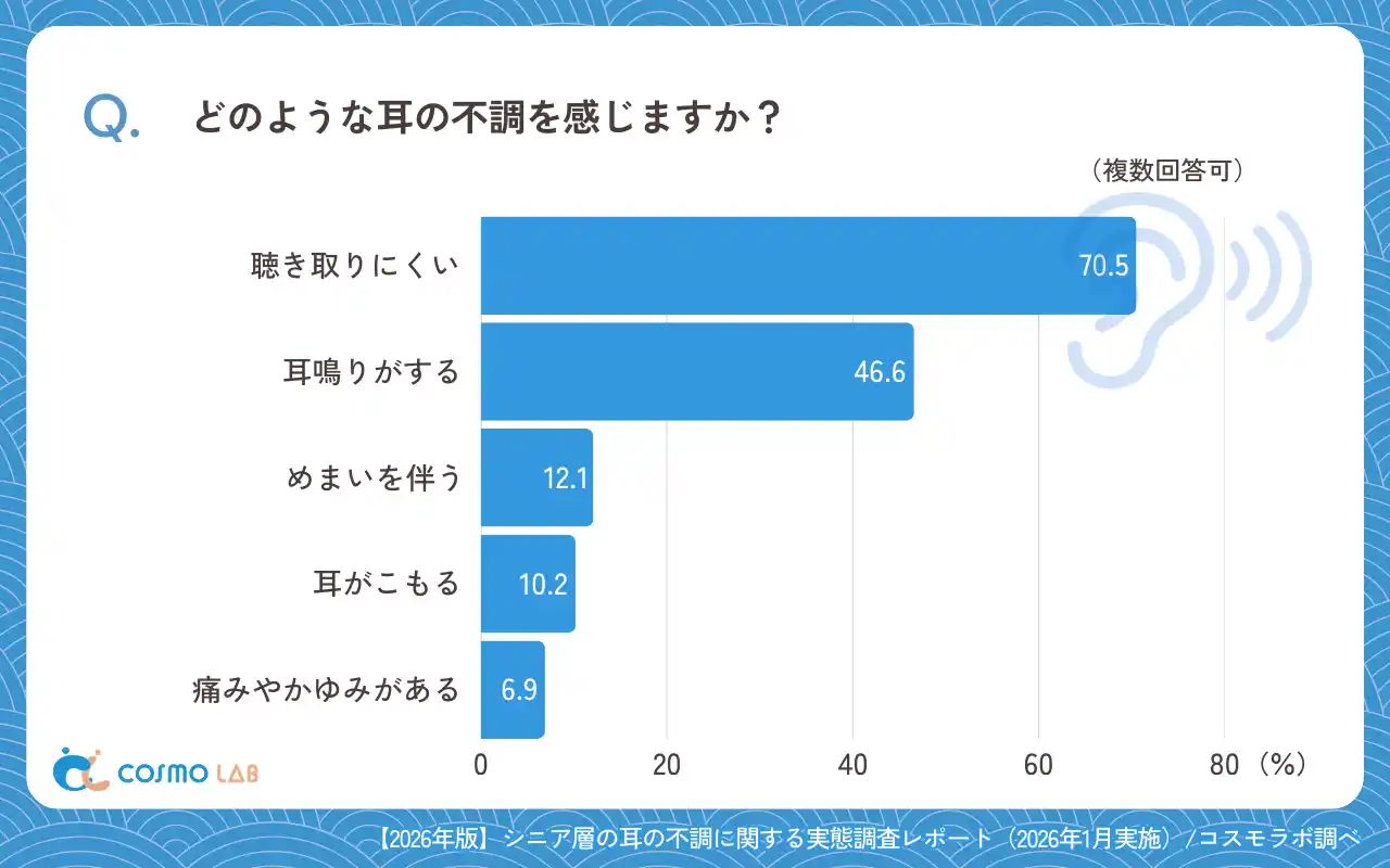 シニア専門のマーケティングプラットホーム コスモラボ(会社名:コスモヘルス株式会社、本社:東京都港区、代表取締役社長 小塚 崇史)がシニア層の『耳の不調』に関するアンケートリサーチのレポートをリリースしました。本レポートでは、50代以上のシニア層を対象に、聴力の低下や耳鳴りなど耳の不調に関するアンケート調査の結果をまとめました。不調の有無や聞こえの状態、自覚した時期や補聴器の利用状況などを整理しています。これらの結果をもとに、今後の情報提供やサービス設計を考える際のヒントを提供します。また、行動傾向や心理的なハードルにも触れながら、早めの対応につながる視点を探ります。