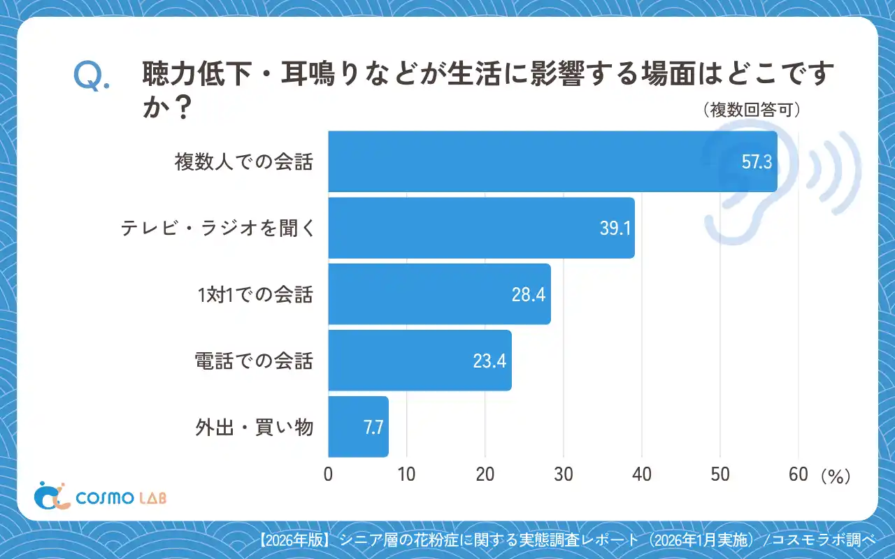 影響する場面では、「複数人での会話」(57.3%)が最も多く、「テレビ・ラジオを聞く」(39.1%)が続きました。 |