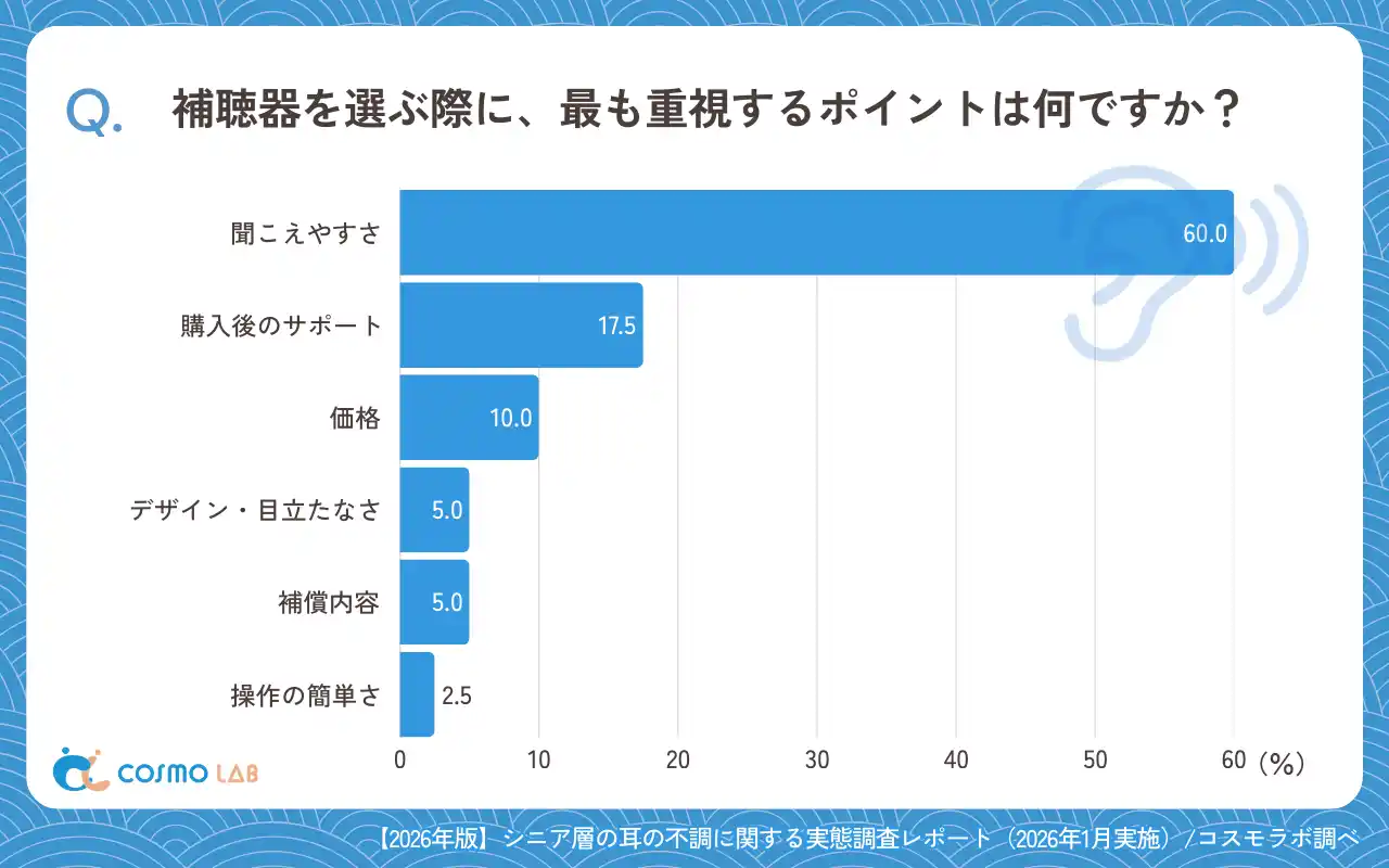 補聴器選びで最も重視するポイントとして、「聴こえやすさ」(60.0%)が突出していました。 |
