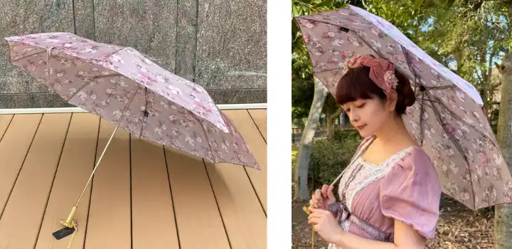 ピンクのトーンにこだわった愛らしいブーケのデザイン、宝箱から取り出したような折りたたみ傘に仕上げました。 |