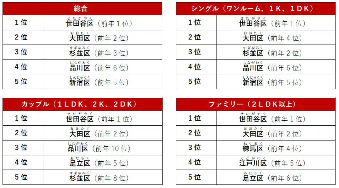 総合1位は前年に引き続き「世田谷区」、2位は「大田区」で、全てのタイプでトップ2を獲得しました。住環境や交通利便性など、多様な街の魅力が評価され、幅広い層から支持を集めたようです。 |