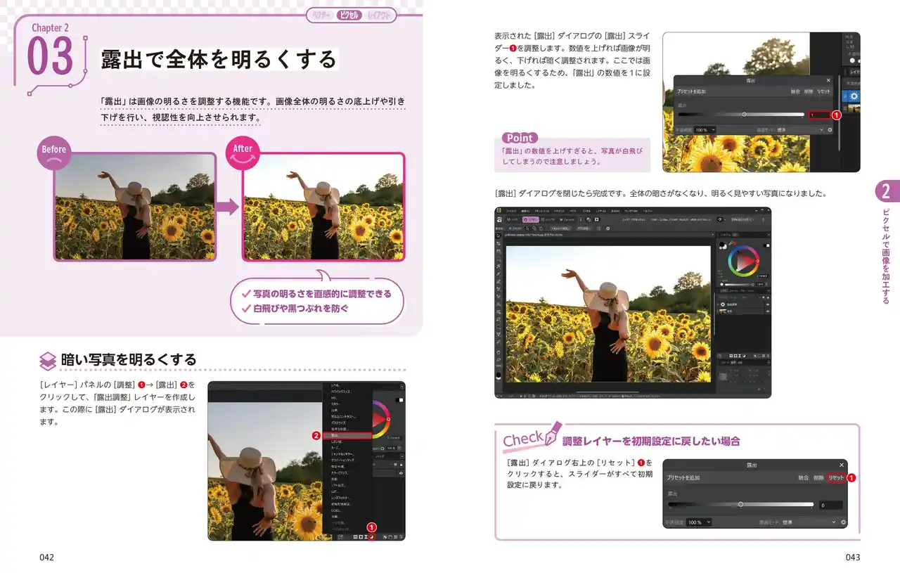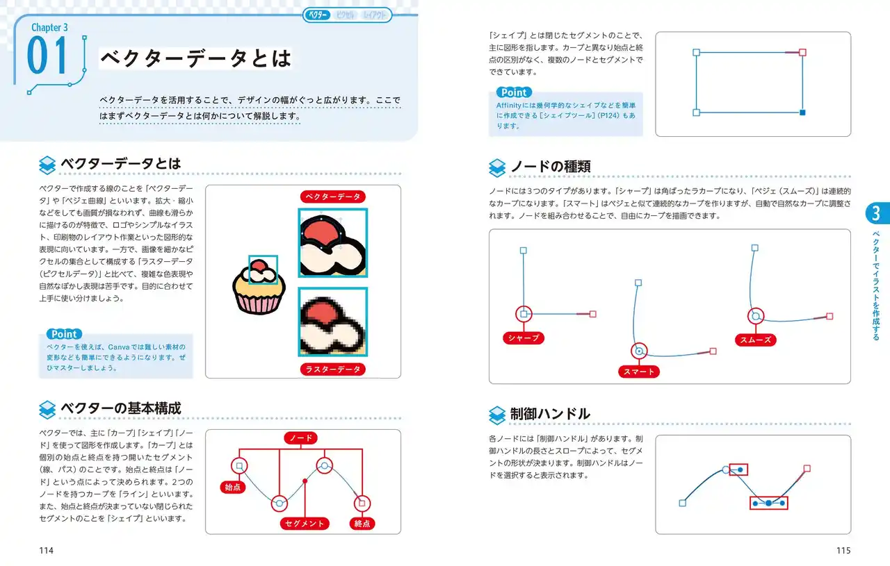 | 本書は、デザイン初心者・入門者向けに、Affinityの3つのメイン機能である「ピクセル(画像編集)」「ベクター(イラストレーション)」「レイアウト(ドキュメント作成)」の使い方をわかりやすく解説しています。各機能でどのようなことができるか、どのような成果物を作れるかがイメージしやすい作例を使った機能解説の他、実践編として実際のデザイン業務でよく行われる写真補正やロゴ、配信用サムネイル、チラシ制作の方法などを掲載。さらに、ピクセル・ベクター・レイアウトを1つの画面内でシームレスに切り替えられる機能を活かすノウハウやCanvaとの連携方法、AI機能なども解説しています。 | ||||||||||||||||